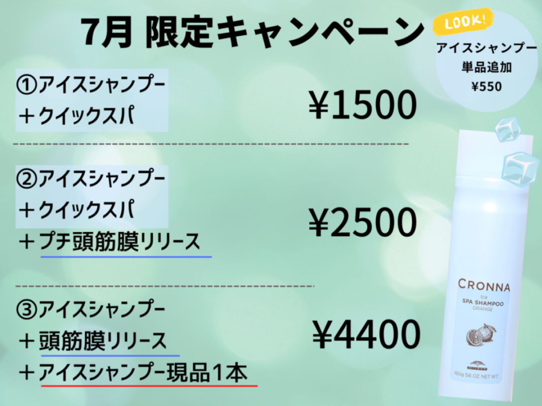 アイスシャンプー+クイックスパ+ハーフ頭皮筋膜リリース(全体時間約15分)2500円のプラン