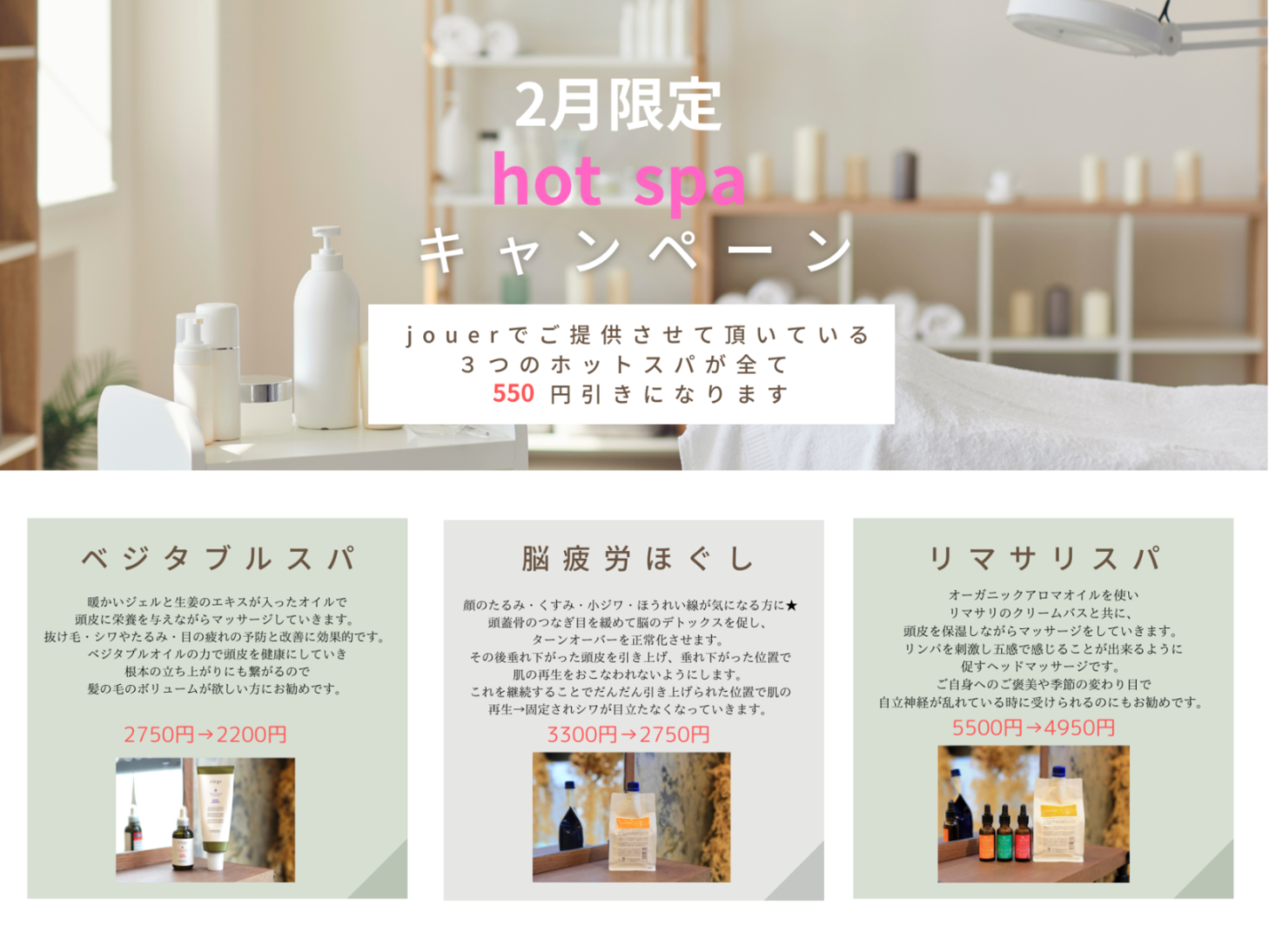 •ホットスパ(ベジタブルスパ2750円、脳疲労ほぐし3300円、リマサリスパ5500円)を全て550円offに。