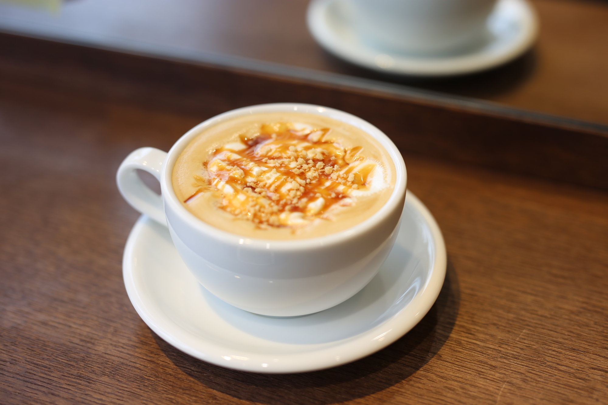 人気のカフェラテの上に生クリーム、キャラメルソース、キャラメルクランチをトッピング♪
